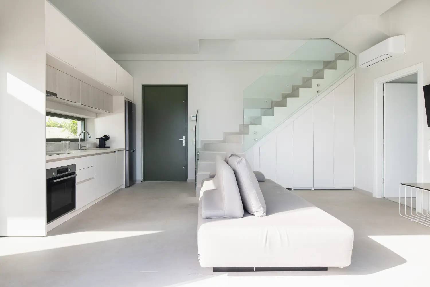 The dazzling sunlight entering through the windows will make your stay in this private hideaway unforgettable. All Villas spread into two levels. The ground floor consists of an open-air kitchen-living area and a bedroom with en-suite bathroom. Following the glass staircase to the first floor, another two bedrooms with en-suite bathrooms are waiting to host you.